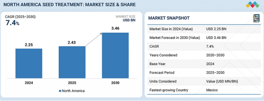 According to MarketsandMarkets, the report titled “North America Seed Treatments Market by Type, Application Technique (Coating, Dressing, Pelleting), Function (Seed Protection and Seed Enhancement), Formulation, Crop Type (Cereals & Grains, Oilseeds, Fruits & Vegetables), and Region – Global Forecast to 2030” estimates the market at USD 2.43 billion in 2025 and projects it to reach USD 3.46 billion by 2030, registering a CAGR of 7.4% from 2026 to 2030.