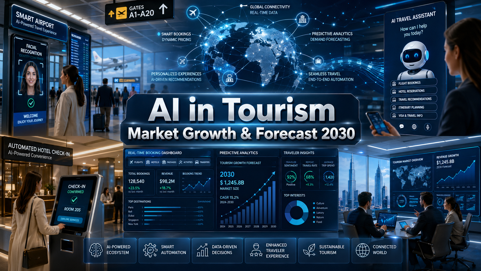 According to a research report “Artificial Intelligence in Tourism Market by Solution (Virtual Assistant & Chatbots, Pricing & Revenue Management, Booking Management System), End Users (Maritime Travel, Aviation, Cruise Line Operators, Resorts & Theme Parks) – Global Forecast to 2030″ published by MarketsandMarkets, the AI in Tourism market size is projected to reach USD 13.38 billion by 2030 from USD 2.95 billion in 2024, at a Compound Annual Growth Rate (CAGR) of 28.7% during the AI in Tourism forecast period (2024–2030).